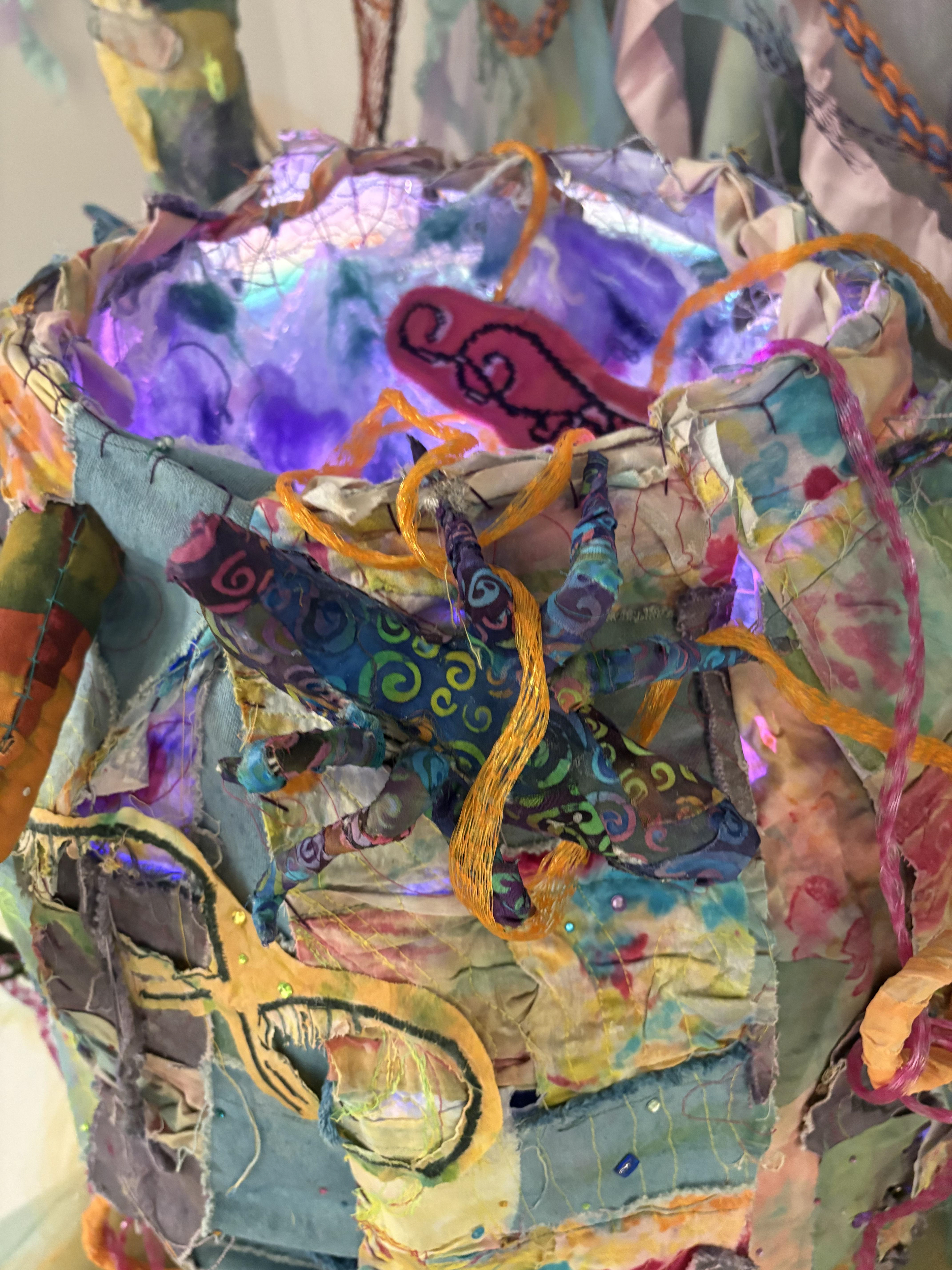 MX dyed cotton, tulle, screen prints, wool roving, beads, rhinestones, yarn, wire, paper mache, embroidery