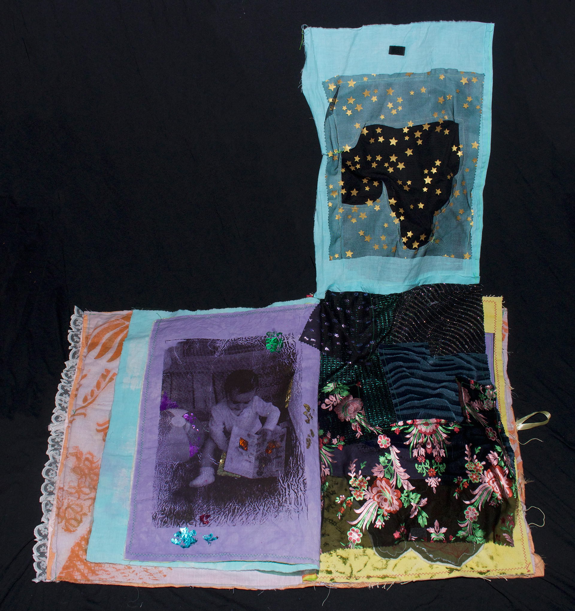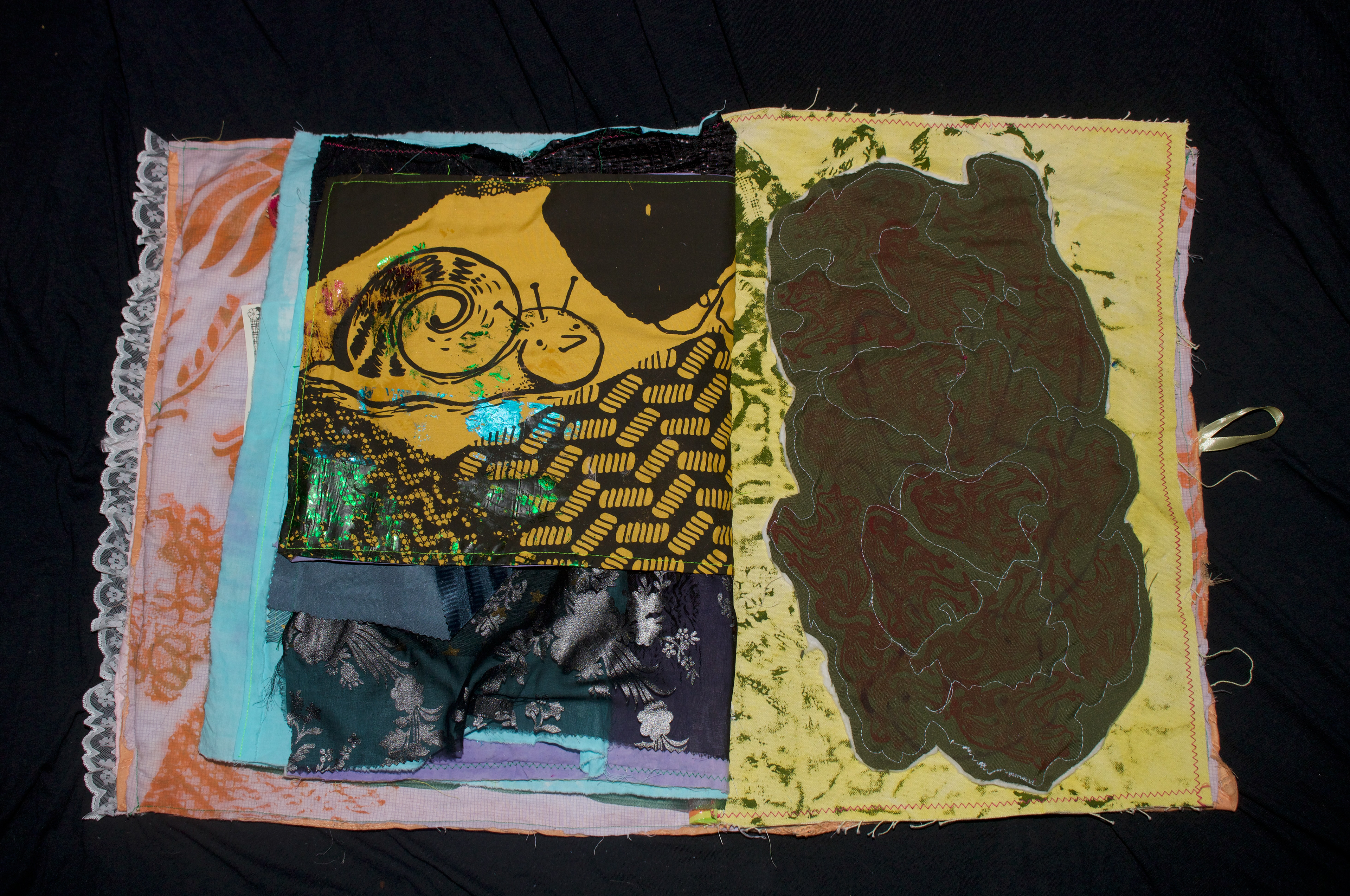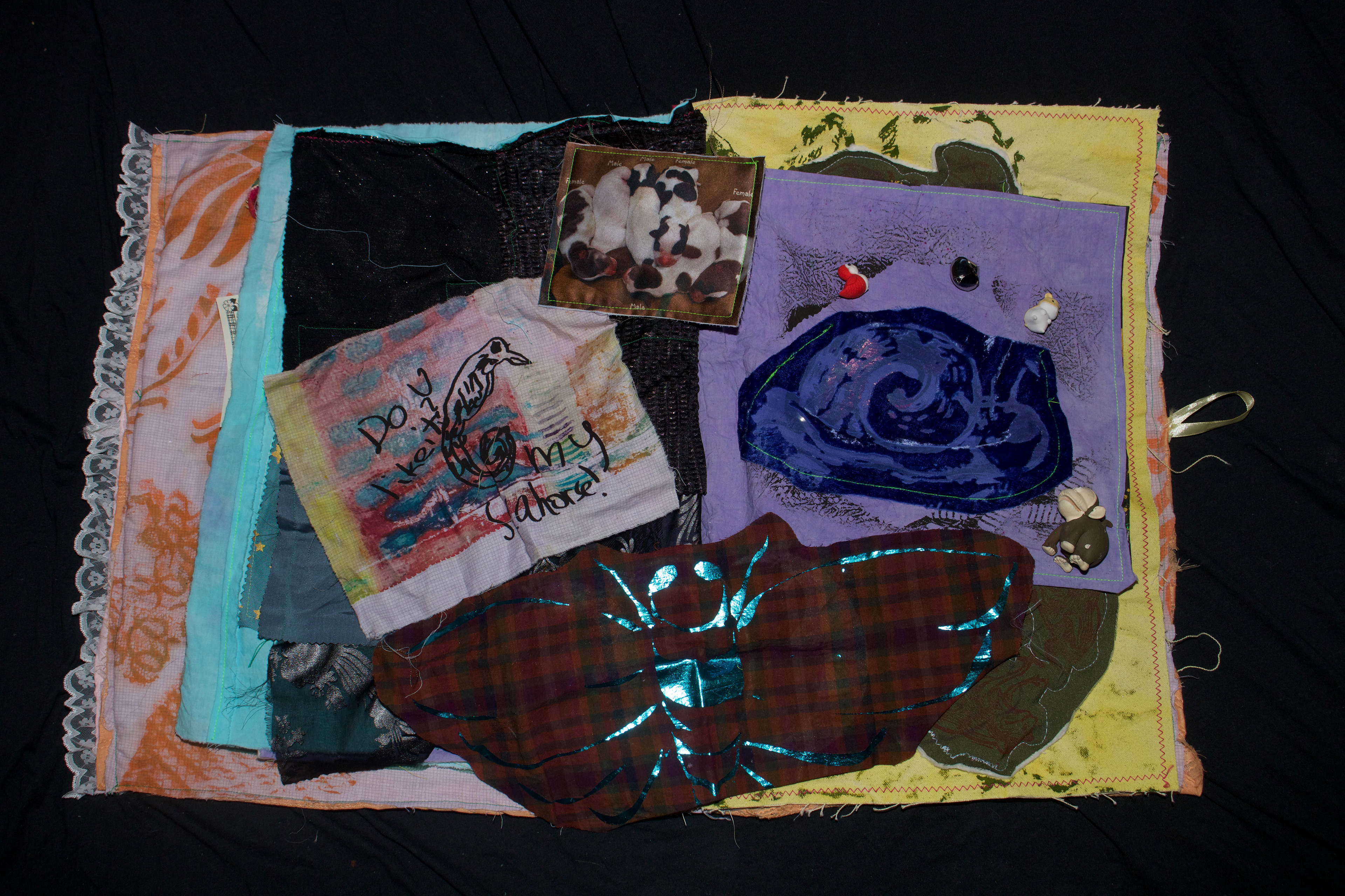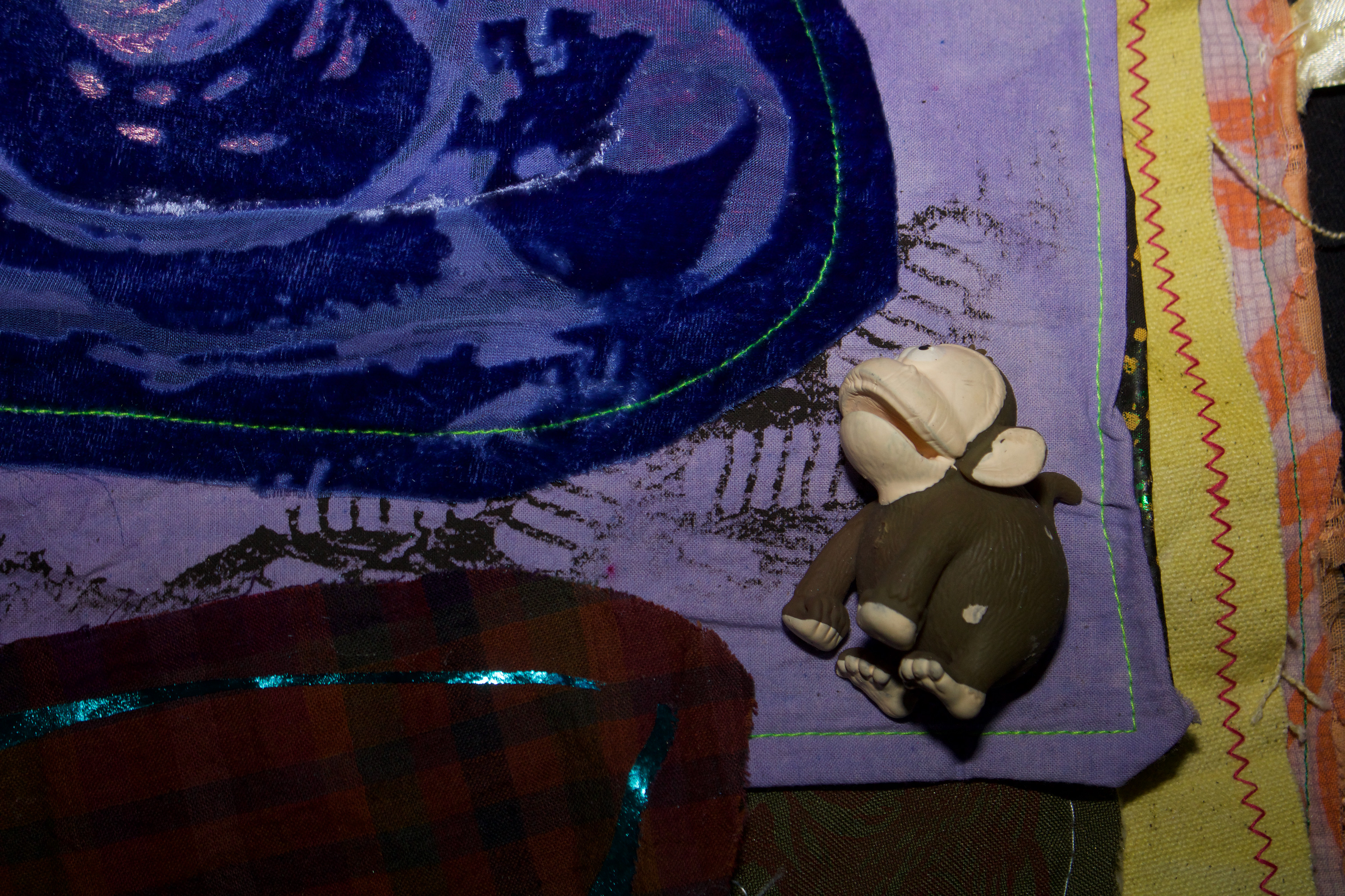 hand dyed cotton (MX), screen prints, stamps, assorted buttons, sequins, pom poms, dried flower, crochet, tassels, embroidery, beads, foil, dye sublimation prints, 31" x 37", 2025