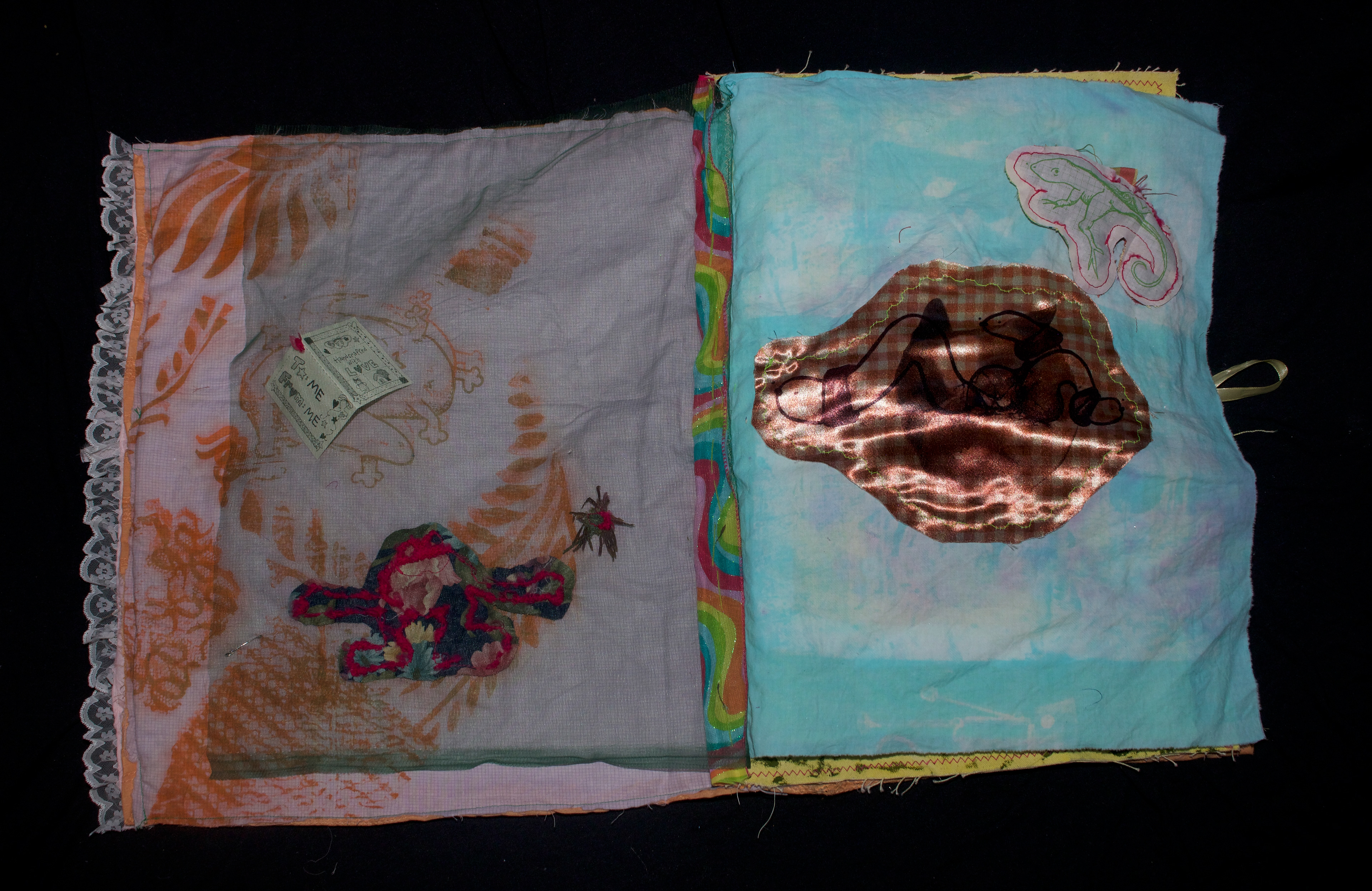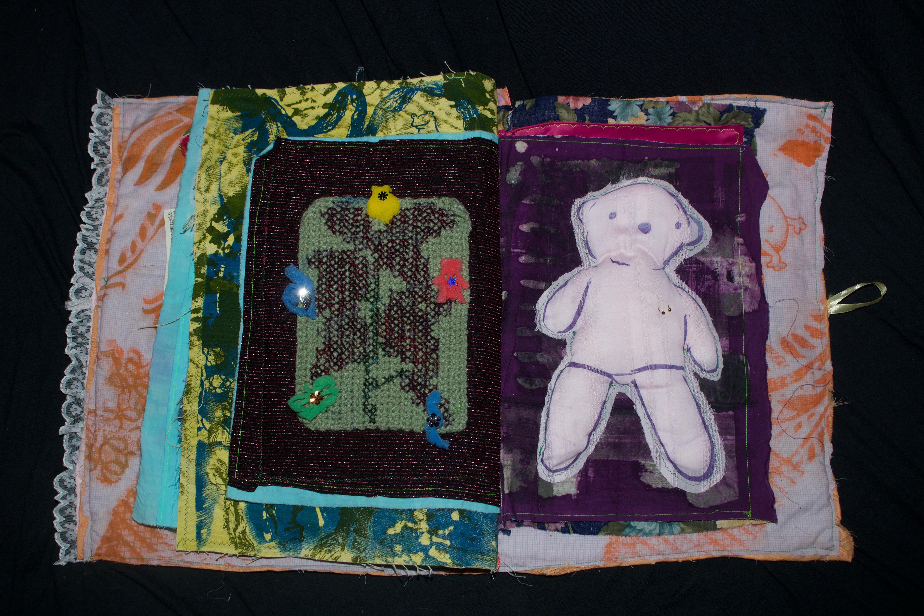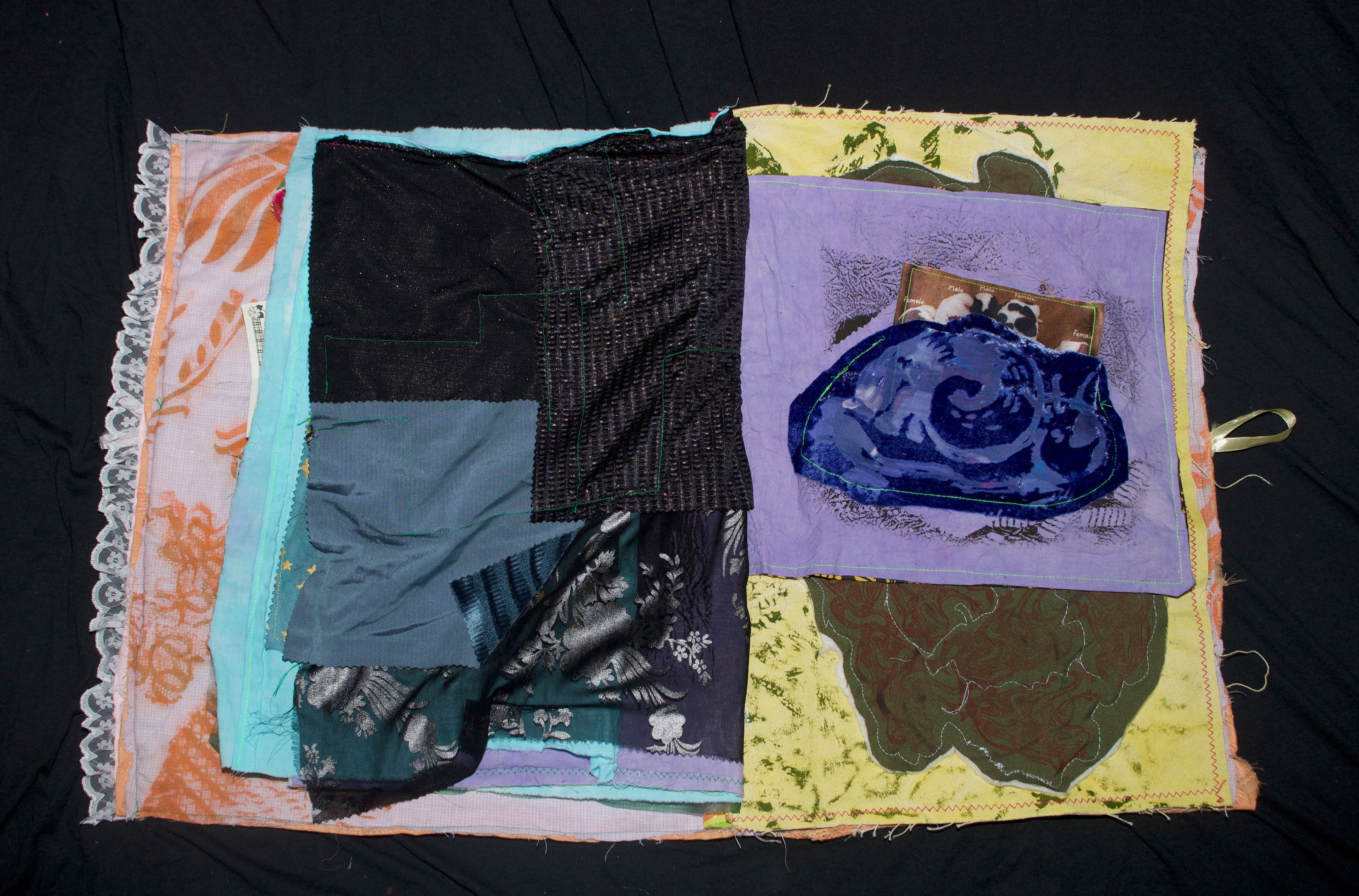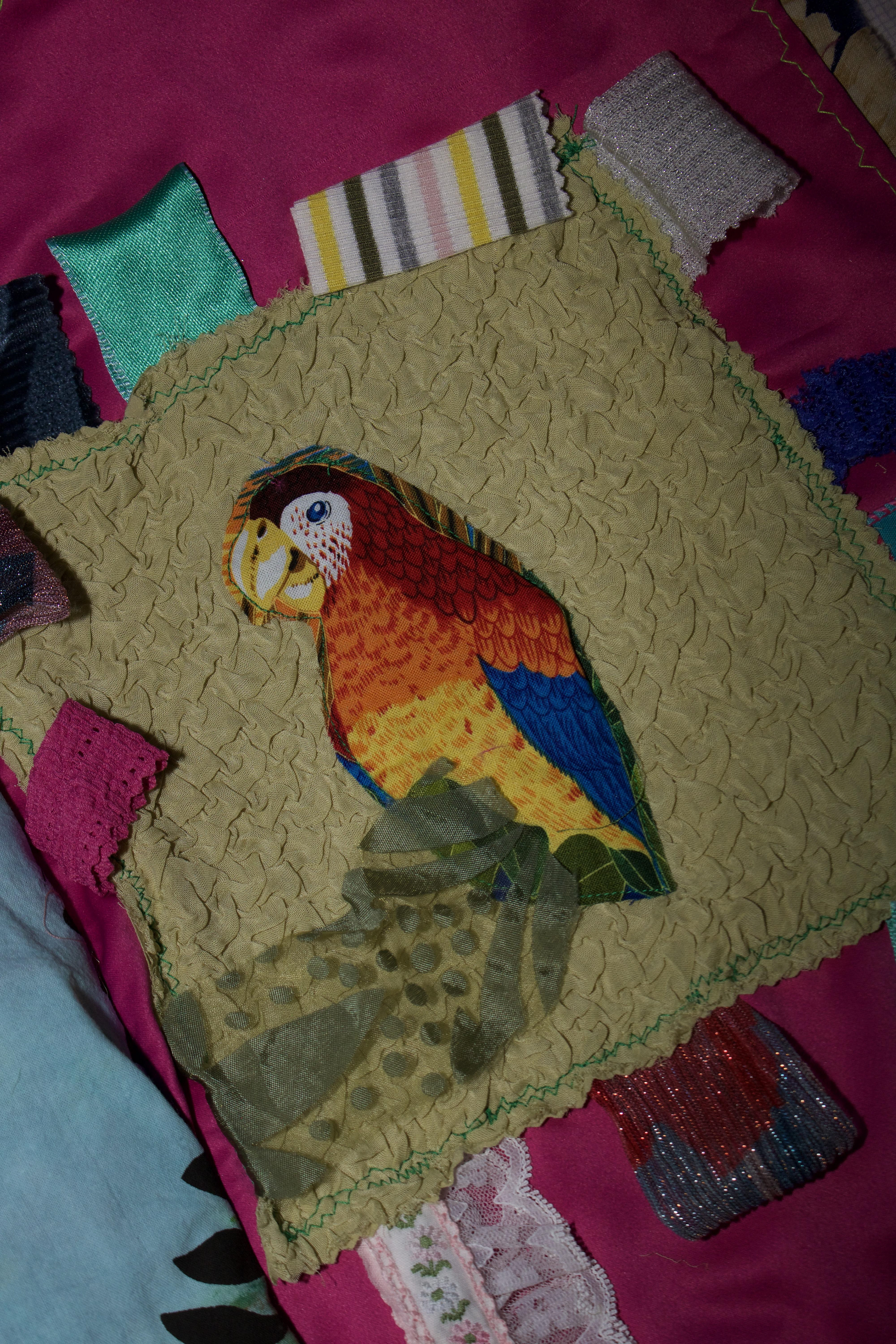 hand dyed cotton (MX), screen prints, stamps, assorted buttons, sequins, pom poms, dried flower, crochet, tassels, embroidery, beads, foil, dye sublimation prints, 31" x 37", 2025
